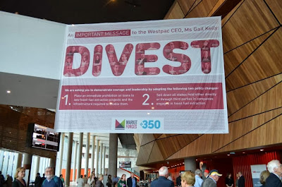 A huge banner was unveiled at the Westpac AGM on 13 December in Melbourne addressed to CEO Gail Kelly calling for Westpac to divest from the fossil fuel sector for the sake of protecting the climate. It was accompanied by an open letter signed by 3,000 Australians. Since January 2008, Westpac has loaned over $1.1 billion to coal and gas export projects, many of them inside the Great Barrier Reef World Heritage Area.